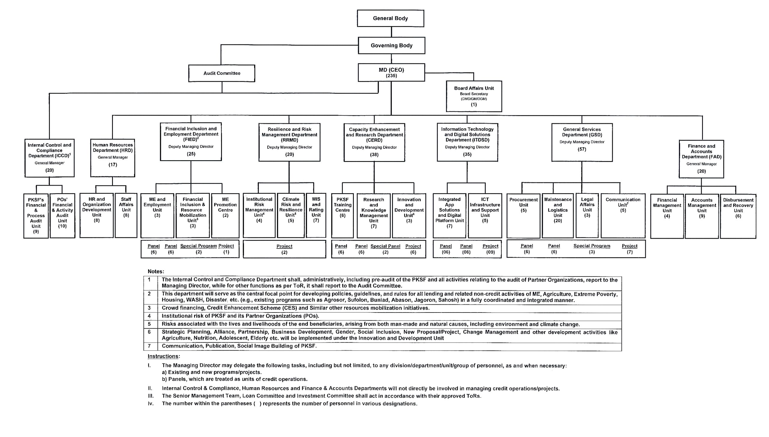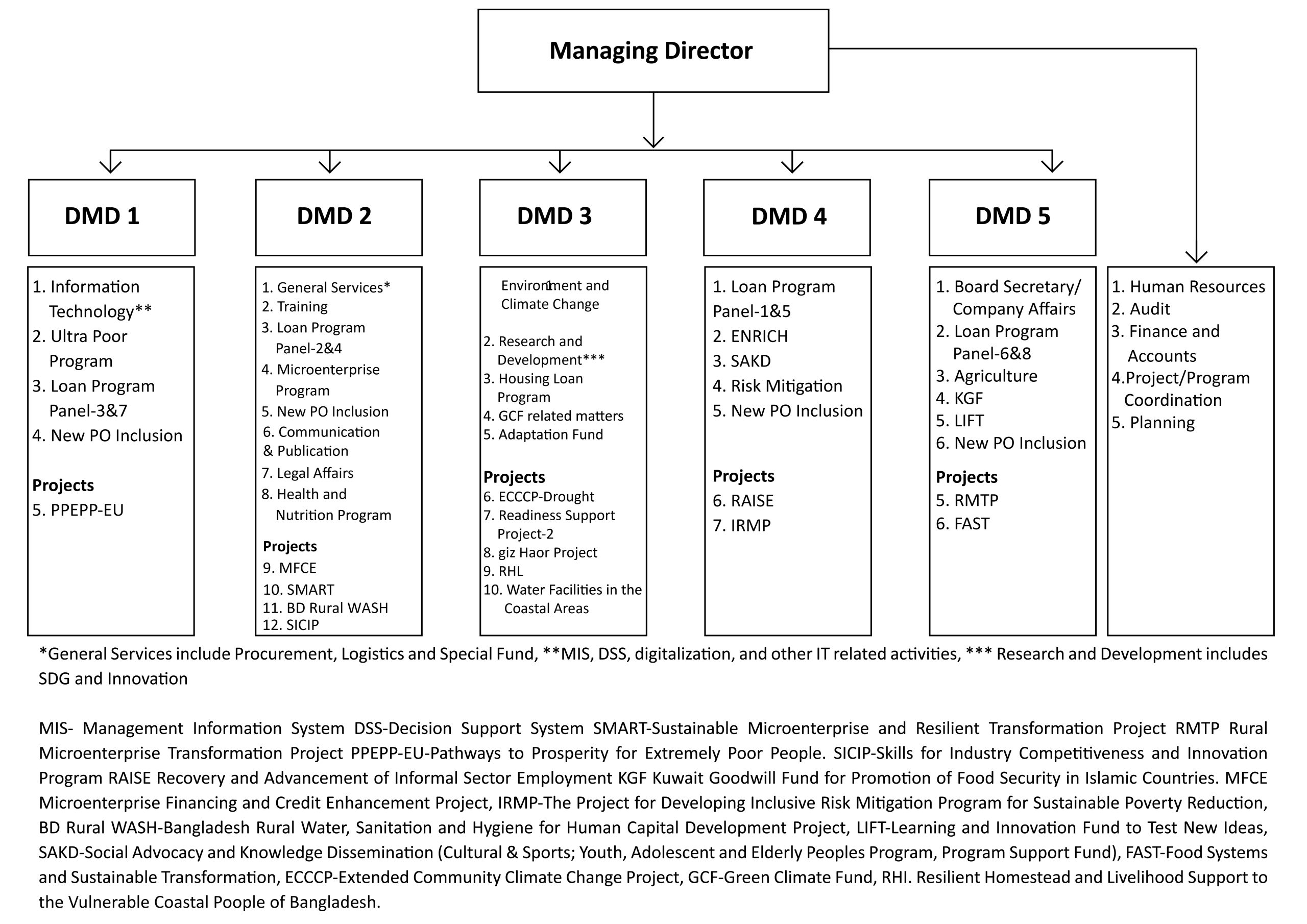 The Managing Director is the chief executive officer of PKSF. There are five Deputy Managing Directors (DMDs) who are responsible for looking after different units of PKSF. Besides, they are also responsible to monitor some programs & projects. One of the Sr. General Managers as the Head of Audit Unit looks after both internal, external & special audit and directly reports to the Managing Director. The core microfinance programs of PKSF such as Jagoron, Agrosor, Buniad and Sufolon are being implemented & monitored by 8 different panels. Each panel is headed by one Panel Supervisor. These panels are the main contact points of the POs at PKSF level. Each panel takes care of around 25 POs. Currently, these panels are administered under the direct supervision of four DMDs.