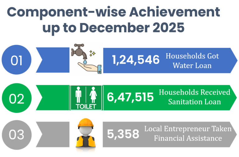 Capacity building of LE: One of the key stakeholders of the project’s implementation in the field is the Local Entrepreneurs (LEs). After receiving proper training and other assistance, they are constructing safely managed twin pit toilets and safely managed water supply systems at the household level. A total of 3,152 LE received hands-on training. Besides, 352 women LEs have received training for business development and promotion of sanitary napkins.