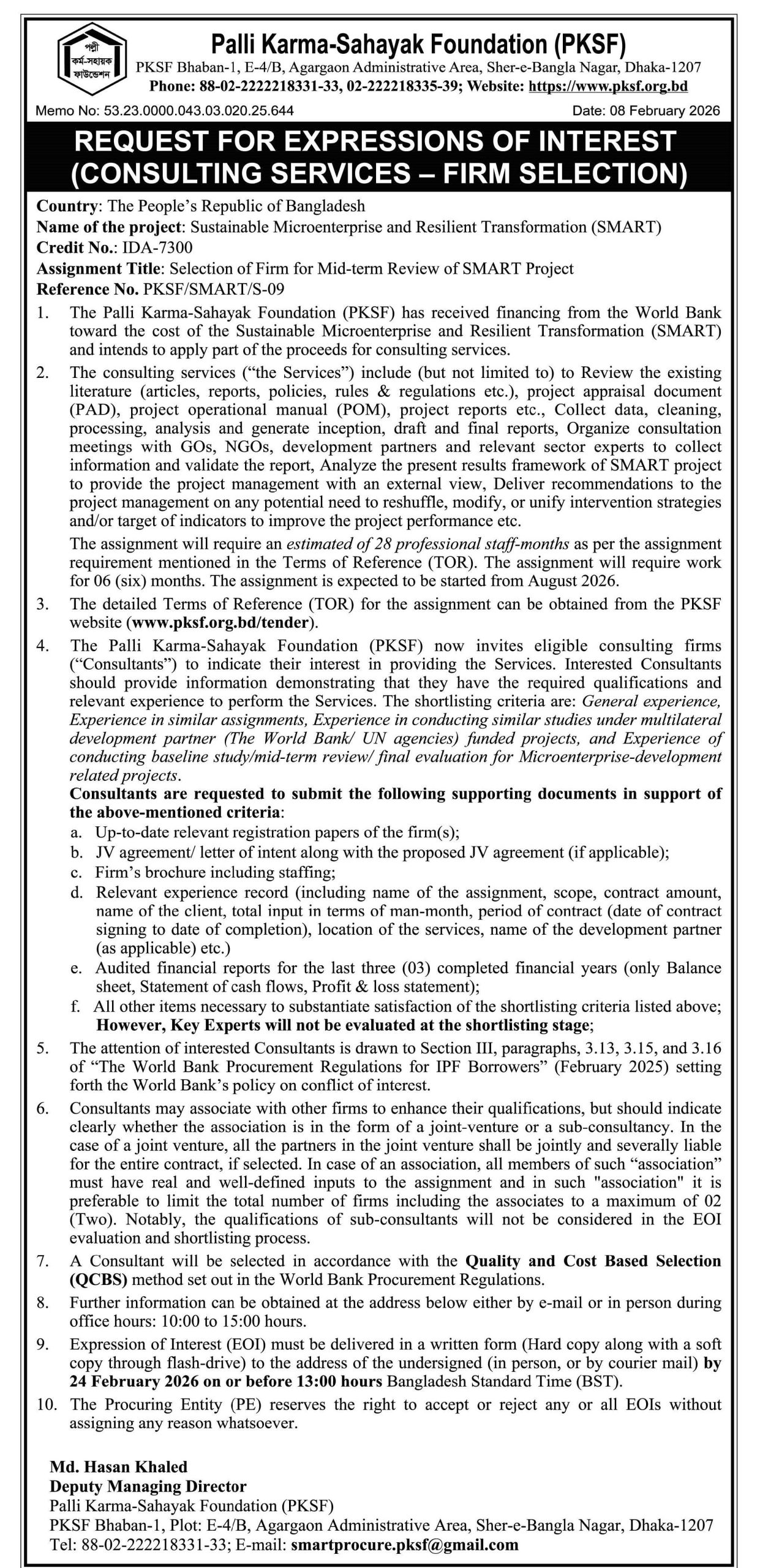 TenderFebruary 8, 2026Request For Expressions Of Interest (REOI) for Selection of Firm for Mid-term Review of SMART Project (PKSF/SMART/S-09) ToR for Mid-term Review of SMART Project PKSF PKSF MD Procurment SMART World Bank45316 Likes